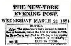 Advertisement for Phelps & Peck; NY Evening Post 1821