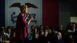 Warren was named as part of the "Hell-No Caucus" by Politico in 2018, along with Senators Cory Booker, Kirsten Gillibrand, Kamala Harris, and Bernie Sanders, given she voted "overwhelmingly to thwart his [Trump's] nominees for administration jobs", such as with Rex Tillerson, Betsy DeVos, and Mike Pompeo; all of the Senators in this group were considered potential 2020 presidential contenders at this point in time.[28] At a town hall meeting in Holyoke, Massachusetts on September 29, 2018, Warren said that "[a]fter November 6, I will take a hard look at running for president", referencing the date of the 2018 United States elections in which she was running for reelection to the Senate.[29][30]