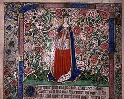One of only three lyric poems in Middle English ascribed to a woman author,[36] alongside "An Anchoress' Hymn to the Virgin" and "Eleanor Percy's Prayer", "My heart is set upon a lusty pin"[37] is attributed to one "Queen Elizabeth", sometimes thought to have been Elizabeth Woodville (although the author is also argued[37][38] to have been her daughter, Elizabeth of York). This hymn to Venus, found in one single manuscript,[39] is a complex six-stanza poem[40] with rhyme scheme ABABBAA, an "elaboration of the sestina",[41] in which the seventh line of each stanza is the same as its first, and the six unique lines of the first stanza provide the first lines for each of the poem's six stanzas.