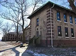 The structures on Island 2 shared the same design as the original facilities on island 1: a brick facade in Flemish bond, quoins, and limestone ornamentation.[73][74][75] All structures were internally connected via covered passageways.[37][70]