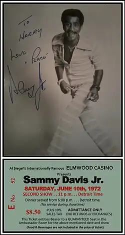 Sammy Davis Jr. performed at the Elmwood several times during his career. Whenever he did, he would rent out the entire sixth floor at the historic Gotham Hotel, as was mentioned in Earnest H. Borden's book Detroit’s Paradise Valley. BlackPast mentioned in an article that Davis was on Gotham's guest list of prominent African Americans.[18] The Gotham was known as a safe and upscale hotel for African Americans.[19] The last hit Sammy Davis Jr. ever had was the song Hello Detroit.[20]