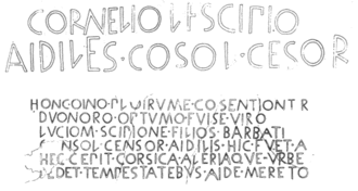 At the beginning, as cited by Cicero, the funerary elogium was a short poem in saturnine verses praising the virtues of the deceased. Augustus wrote such an epitaph in verse as an inscription on the tomb of his adoptive son Drusus (died 9 BC). In the Tomb of the Scipios, a republican funerary monument on the Appian Way, funerary inscriptions on the sarcophagi of the Scipions can be considered elogia.[3] The elogia of the Scipios, composed later than 240 BC, are in saturnian metre, in archaic Latin, and show the increasing Hellenisation of Roman society. In fact, alongside the typically Roman values of Virtus and physical strength, those of beauty and wisdom, representative of the Greek culture, appear.[8] Below is the elogium of Lucius Cornelius Scipio, son of Lucius Cornelius Scipio Barbatus, whose elogium is also extant:[8]