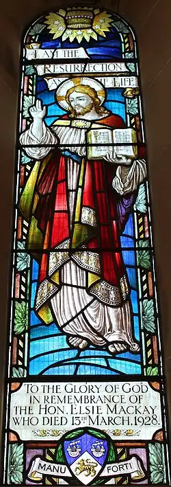 Elsie Mackay is commemorated by a stained glass window in the chancel of Glenapp Church in the parish of Ballantrae, Ayrshire (where her father owned the Glenapp estate).[17] Rhododendrons, now somewhat overgrown, spell out "Elsie" on the opposite side of the glen.(55°01′44″N 5°00′50″W / 55.0288°N 5.014°W / 55.0288; -5.014)[9] A street is named after her in Gander, Newfoundland and Labrador.[18] Her financial legacy was the Elsie Mackay Fund, a £500,000 trust bequeathed by her father that was left to the British nation on 12 December 1928, for 50 years and used to help pay off the national debt.[9][19][20]
