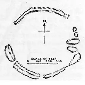 The hill fort is oval and 2.9 hectares in area.[8] It was enclosed in the 1830s and laid to pasture and last ploughed around 1943.[9] A polished stone axe was found at the site.[10]