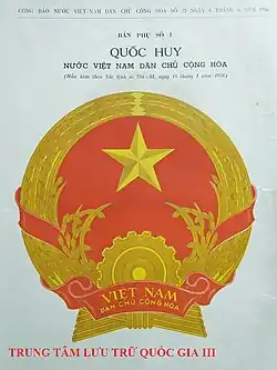 Regarding this last sample of the North Vietnamese national emblem, artist Bùi Trang Chước wrote: "This time I also drew a circle around the two sides, there are more rice flowers extending upwards, adjacent to the border. Each of them are located at the top of the circle, the two sides still keep the rice flowers hanging down to embrace now a cogwheel rather than an anvil. At the bottom, the silk ribbon in the middle has the words Việt Nam Dân chủ Cộng hòa ("Democratic Republic of Vietnam"). The silk ribbon is still wrapped on the rice stalks with 2 sections on each side, the roots of the rice flowers cross each other to form the emblem."[7] The sun below the star and its rays were also removed.[7] In terms of colour, the background inside of the North Vietnamese National Emblem and the silk medal is red, while other motifs such as the rice flowers, stars and wheels are yellow.[7]
