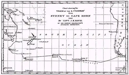 - ^ Davis, J.K. (Dec 1910). "Voyage of the S. Y. "Nimrod.": Sydney to Monte Video Viâ Macquarie Island, May 8-July 7, 1909". The Geographical Journal. 36 (6). Blackwell Publishing: 696–703. doi:10.2307/1776845. JSTOR 1776845.