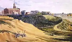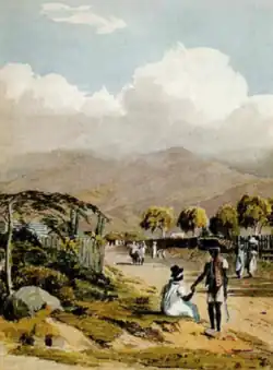 The Church of San Isidro, taken from doña Mariquita Thompson's is of interest for several reasons. Unlike the other Argentine watercolours in this section, it was not chosen for publication by Ackermann and hence did not go through the mediation of his engravers and colourists — London artists who had never been to Buenos Aires.[75] It can be discerned whether it less "muddy" than Ackermann's productions. It was drawn from the summer estate of Mariquita Sánchez de Thompson, a prominent Argentine patriot and revolutionary who kept a literary salon. It shows the town of San Isidro with its early eighteenth century church. "It has great iconographic value, because it makes us know for the first time the aspect of one of those rarely depicted towns of Buenos Aires province, with its miserable dwellings of primitive architecture beside impassable streets",[63] though today the town is prosperous.