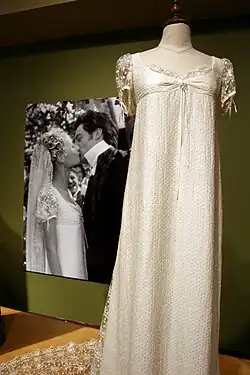 Emma's wedding dress was made from silk crepe and embroidered with a small sprig pattern, while the sleeves and the train were made from embroidered net.[22] Of the dress, Myers stated "The inspiration for Emma's wedding dress began with a small amount of exquisite vintage lace that became the overlay. I wanted a look that would work not only for the period but also one that would compliment [sic] Gwyneth Paltrow's youth, swan neck, and incredible beauty. I was also hoping to evoke happiness and the English countryside; the sun did shine on the day we shot the scene!"[22]