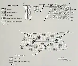 A Granodiorite body five miles (8 km) long, north to south, and up to two miles (3.2 km) wide, underlies the district. This body intruded into surrounding metamorphic rocks. Gold ore deposits reside in the quartz veins, ranging from 3 to 7 ounces per ton. The Empire Vein outcrops to the east on a north–south strike, dipping at a 35-degree angle to the west. The vein was mined with inclined shafts following dip, with horizontal shafts (drifts) every 300–400 ft (90–120 m) along strike. The ore was mined by stoping.[6]: 25 [10]: 53–59