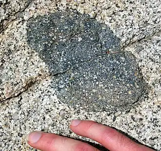 In geology, an enclave is an aggregate of minerals or rock observed inside a larger rock body. Usually it refers to such situations in plutonic rocks. Micro-granular enclaves in felsic plutons result from the introduction of mafic magma into the magma chamber and its subsequent cooling following incomplete mixing.[1]