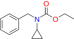 The condensation between cyclopropylamine [765-30-0] (1) and benzaldehyde [100-52-7] (2) gives N-benzylidenecyclopropylamine [3187-77-7] (3). The reduction of the Schiff-base gives N-benzylcyclopropylamine [13324-66-8] (4). Urethane formation with ethyl chloroformate [541-41-3] (5) completes the synthesis of encyprate (6).[2][3]
