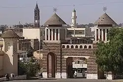 Enda Mariam compound with, in the background, the bell tower of the Church of Our Lady of the Rosary and the minaret of Kulafah Al Rashidan Great Mosque