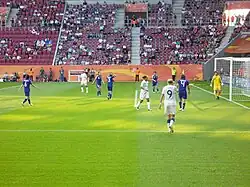 In Germany, England was put into a group with Japan, New Zealand and Mexico. In the first game against Mexico, England tied 1:1.[6] England defeated New Zealand 2-1 and Japan 2–0 to take England's first ever group victory at a World Cup.[7][8] In the quarter-finals England played France. England took the lead in the 59th minute after a scoreless first half, but France equalized two minutes before the end of regular time. In the ensuing overtime, neither team scored, leading to a penalty shoot-out. Although the first French shooter failed and the first three English women were successful, all other French women scored and the last two English women, Claire Rafferty and captain Faye White, did not.[9] England were the only team to have defeated the eventual champion Japan.