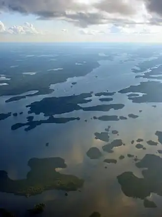 The English River is a river in Kenora District and Thunder Bay District in Northwestern Ontario, Canada.[3] It flows through Lac Seul to join the Winnipeg River at Tetu Lake as a right tributary.[4] The river is in the Hudson Bay drainage basin, is 615 kilometres (382 mi) long and has a drainage basin of 52,300 square kilometres (20,200 sq mi).[2] Although there are several hydroelectric plants on this river, the English River upstream of Minnitaki Lake is notable as one of the few large river systems in northwestern Ontario with a natural flow and without any upstream source of pollution.[5] It is the fourth longest river entirely in Ontario.