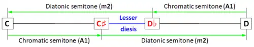 The enharmonic scale uses dieses (divisions) which are not tuned in any pitch present on standard modern keyboards,[2] since modern, standard keyboards only have provisions for half-tone steps. The two different notations used for vocal and instrumental notes in ancient Greek music notation are more tonally versatile, since they are based on quarter-tones = half-sharps, with step sizes that could be altered from a strict quarter tone step.[4] Despite the pitches being unknown to naïve occidentally-trained musicians, all the ancient Greek tuning systems only require seven distinct pitches in a completed octave, and only the four of those pitches, the two that lie between the fixed tonic and subdominant (or fourth) (relative to CMaj, the notes between C and F), and the other two movable notes between fixed dominant / fifth and the octave (between G and C′). When expressing notes with modern letter notation, it is conventional to use some elaborately sharpened or flattened version of the notes D, E, A, and B, representing not their precise pitches, but merely to follow the modern standard of giving every distinct pitch in a scale its own, separate letter.[4]