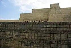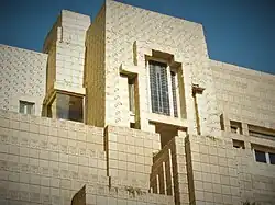 The Ennis House was built at a time when Wright was transitioning away from the Prairie-style designs of his early career and toward the Usonian designs of his later career.[36] It is sometimes described as having a Mayan Revival design,[37][38] inspired by the motifs of Puuc architecture in Uxmal.[39][40] Jim Guichard, who helped train the house's docents in the 1980s, said the house's architectural style had been selected because Wright wanted "an architecture indigenous to America" and found the Mayan style to be suitable for the southwestern U.S.[41] Wright wrote that he had been inspired by Native American and Mexican motifs, saying in 1957 that he had wished to visit Central America at some point.[32] The house has also been described as a "Californian Romanza" structure since its design was influenced by numerous architectural styles, including those of Egypt, China, and western Europe.[22] The writer Merrill Schleier described the patterns in the house's design as having been influenced by Japanese or Moorish architecture.[42] A 2001 Architectural Record article described the design as bearing Cubism or Corbusian elements while stating that Wright's influence was still evident.[43]