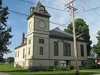 The Enosburg Opera House stands in the village of Enosburg Falls, on the north side of Depot Street midway between Pleasant Street and Vermont Route 108. It is a large rectangular wood-frame structure, with a single story set on a high basement and stone foundation. A 3+1⁄2-story square tower rises from one corner, forming a highly visible landmark in the village. It has a gable-on-hip roof and its exterior is finished in clapboards. The main entrance is set in a recess on the street-facing front facade, providing access to the basement level.[2]