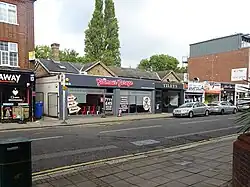The old station building, now mostly obscured by modern shop fronts (date 2020).
