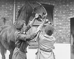 Two veterinarians attending to the teeth of an army horse in London during World War I