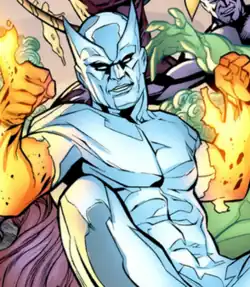 Equinox's powers were similar to the combined abilities of superheroes the Human Torch and Iceman, with whom he first battled,[3] as well as enhanced strength and durability. His mother attempted to teach herself about her late husband's work to find a way to cure her son, but was ultimately forced to let Equinox commit robberies so she had the resources to carry out her research. The shifting exothermic state of his transformations had a dangerous effect on Equinox's mental state, and he ultimately went on a rampage, engaging in conflict with the superheroes Spider-Man, Yellowjacket, and the Wasp, during which his origin was revealed. The three heroes managed to apparently cure him using technology conceived by his mother and constructed in the Baxter Building while the Fantastic Four were away, Spider-Man refining the technology while Wasp and Yellowjacket kept Equinox busy.[4]