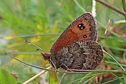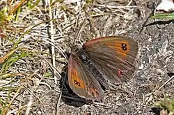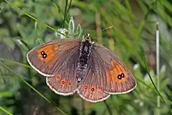 Erebia is a Holarctic genus of brush-footed butterflies, family Nymphalidae. Most of the about 90–100 species (see also below) are dark brown or black in color, with reddish-brown to orange or more rarely yellowish wing blotches or bands. These usually bear black spots within, which sometimes have white center spots.
