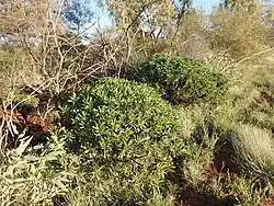 This eremophila has attractive, large, dark green, glossy leaves but its flowers are unremarkable. It is similar to E. fraseri except that it more frost resistant than that species.[7]