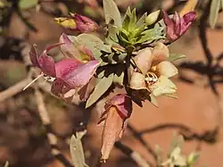Eremophila miniata, commonly known as kopi poverty bush,[2] or plumridge[3] is a flowering plant in the figwort family, Scrophulariaceae and is endemic to Western Australia. It is an erect shrub with many tangled branches, greyish leaves and flowers which vary in colour, ranging from reddish to yellow or cream.