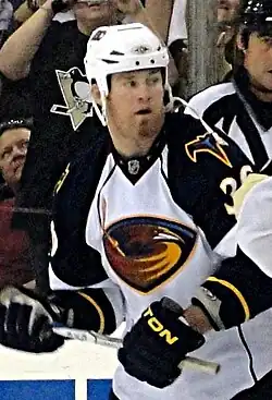 Boulton was re-signed by the Thrashers in 2008 to a two-year deal. He recorded his first career hat trick on December 18, 2010, against the New Jersey Devils. He then signed as an unrestricted free agent with the Devils for a 2-year contract worth $575,000 in the first year and $750,000 in the second, joining former Thrashers teammates Ilya Kovalchuk and Johan Hedberg.[2] After a dismal season in which the Devils did not record a single goal for with Boulton on the ice, Boulton was bought out of the final year of his contract on June 30, 2012. The next day, Boulton proceeded to sign a one-year deal with the New York Islanders.[3] He re-signed with the Islanders for the next three consecutive seasons as well, all on one-year deals.[4] Boulton is the Thrashers' all-time leader in penalty minutes with 639 penalty minutes.