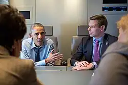 On December 12, 2013, Swalwell introduced the Philippines Charitable Giving Assistance Act into the House.[43] The bill allowed Americans to deduct from their 2013 taxes any charitable donations made between January 1 and April 15, 2014, for the relief of victims in the Republic of the Philippines of Typhoon Haiyan.[43] The typhoon caused an estimated $1 billion in damage and killed thousands of people.[44] Swalwell said, "Typhoon Haiyan devastated many parts of the Philippines and we should make it as easy as possible for Americans who want to assist those affected by the storm."[44] Swalwell saw the bill as providing "another incentive for Americans to donate and donate now—when their help is needed most".[44] On March 25, 2014, President Barack Obama signed this legislation into law.[45]