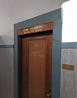 In the 1990s, the apartment complex Strehlow Terrace was renamed Ernie Chambers Court.[82] In 2008, a room at the Nebraska Capitol used for Judiciary Committee meetings was named the Ernie Chambers Memorial Hearing Room.[83]
