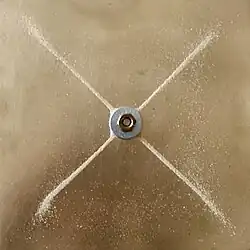 One of Chladni's best-known achievements was inventing a technique to show the various modes of vibration on a rigid surface, known as Chladni figures or Chladni patterns due to the various shapes or patterns created by various modes. When resonating, a plate or membrane is divided into regions that vibrate in opposite directions, bounded by lines where no vibration occurs (nodal lines). Chladni repeated the pioneering experiments of Robert Hooke who, on 8 July, 1680, had observed the nodal patterns associated with the vibrations of glass plates. Hooke ran a violin bow along the edge of a plate covered with flour and saw the nodal patterns emerge.[10][8][9][11] Hooke had already observed this 9 years earlier in 1671, and in turn was inspired by a suggestion he read in Bacon's Sylva Sylvarum, where Bacon describes rubbing the rim of a glass filled with water and observing the water "frisk and sprinkle". Hooke presented this in 1680 to the Royal Society, and there was no follow-up.[12]