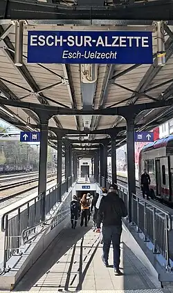 Esch-sur-Alzette railway station (Luxembourgish: Gare Esch-Uelzecht, French: Gare de Esch-sur-Alzette, German: Bahnhof Esch-an-der-Alzette) is a railway station serving Esch-sur-Alzette, in south-western Luxembourg. It is operated by Chemins de Fer Luxembourgeois (CFL), the state-owned railway company. CFL general refer to the station as Esch/Alzette as shown on the sign.