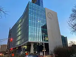 The Martin Luther King Jr. Justice Building at 490 Martin Luther King Jr. Boulevard was designed by Comito and Associates of Newark and built between 2018 – 2021. The four-story glass, steel and concrete structure is just south of the Hall of Records and joined to it with a glass "skywalk". The building has 11 courtrooms.[9] The County Clerk is headquarter in the building. Two statues of Martin Luther King Jr. are located on the grounds. Busts of human rights advocates Congressman John Lewis, Supreme Court Justice Ruth Bader Ginsburg and Congressman Peter Rodino are found in the lobby. Busts of Supreme Court Justices Sonia Sotomayor and Thurgood Marshall civil rights activist Rabbi Joachim Prinz, and Lieutenant Governor of New Jersey Sheila Oliver are planned.