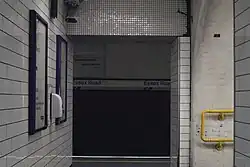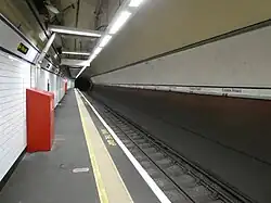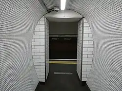 At the lower level the lifts and staircase (of 156 steps) are connected to the platforms via a passageway and a short staircase rising between the two tunnels. The Underground's former operation of the station is evident from the unused and rusty fourth rail which once provided a return of the current from the tube trains serving the line. The third rail is still in use, with return now through the running rails. Signs at street and platform level use Helvetica and logos which still reference Network SouthEast, despite that brand being defunct for over 30 years.