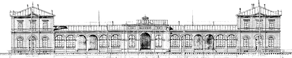 Construction of the first single-storey station building in 1846 was probably led by George Morlok to a design by Michael Knoll. Knoll's design was in a simple style and a slim, eight-axis construction with a gable roof. On the city side there was an entranceway through an arcade.[4]