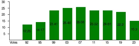 | Election | Leader | Votes | % | Seats | +/– | Status |