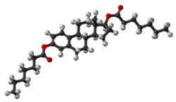 Estradiol dienanthate (EDE), sold under the brand names Climacteron among others, is a long-acting estrogen medication which was previously used in menopausal hormone therapy for women and to suppress lactation in women.[1][2][3][4] It was formulated in combination with estradiol benzoate (EB), a short-acting estrogen, and testosterone enanthate benzilic acid hydrazone (TEBH), a long-acting androgen/anabolic steroid.[2][3][4] EDE has not been made available for medical use alone.[5] The medication, in combination with EB and TEBH, was given by injection into muscle once or at regular intervals, for instance once every 6 weeks.[6][7][8]