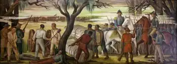 Under President Franklin Roosevelt's New Deal, several programs were created to employ Americans during the Great Depression. The Magafan twins worked under the New Deal's Section of Painting and Sculpture, a program that hired thousands of artists to paint murals in public spaces, particularly post offices.[2] Ethel and her twin sister, Jenne Magafan, became widely known for their murals painted during the Great Depression. Ethel received her first of seven Government commissions when she was commissioned to produce a painting for the United States post office in Auburn, Nebraska, titled Threshing.[3] Other murals commissioned by the US Government hang in the United States Senate Chamber, the Social Security Building and the Recorder Deeds Building in Washington, D.C., and in post offices in Wynne, Arkansas, titled Cotton Pickers in 1940; in Madill, Oklahoma, titled Prairie Fire in 1941; and Englewood, Colorado, titled The Horse Corral in 1942.[4] Her final mural, entitled Grant in the Wilderness, was installed in 1979 in the Chancellorsville Visitor Center at the Fredericksburg National Memorial Military Park in Virginia,[5]