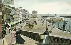 The branch line to Mers was opened to traffic on July 10, 1904.[11] An initial commissioning took place on June 26. However, service was suspended the following day after a three-masted ship damaged the overhead wire supports on the swing bridge connecting the outer harbor to the floating dock at Le Tréport.[11] The extension added over 750 meters to the network and was initially operated only during the summer season. Further negotiations with the municipal authorities of Mers led to an extension to La Prairie, in the town center, which opened on July 2, 1909.[11] This additional 400-meter section brought the total network length to 6,290 meters.[12] Service on the branch line was initially provided at 30-minute intervals, later increasing to 20-minute intervals during the summer. Special departures were scheduled to accommodate the end of performances at the Le Tréport casino.[13]