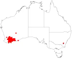 3. ^ a b c Brooker, M.I.H. & Hopper, S.D. (2002) Taxonomy of species deriving from the publication of Eucalyptus subseries Cornutae Benth. (Myrtaceae). Nuytsia 14(3): 356-358, Figs 9 (map), 10