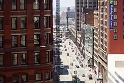 ![]() Looking westbound on Euclid Avenue from above E. 9th Street and the Schofield Building. The Soldiers' and Sailors' Monument can be seen in the distance. | |