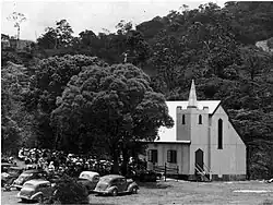 The foundation stone of the Eungella Presbyterian Church was laid in July 1947 and it was officially opened on 23 November 1947. The church was designed to be a replica of Reverend Maitland's father's church in Victoria. The church was damaged in March 2010 in Cyclone Ului and again in February 2011 in Cyclone Yasi. The church was demolished in April 2011.[19]