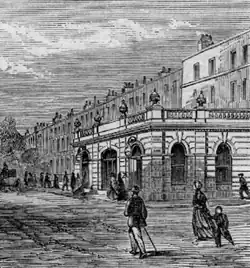 The station was opened as Gower Street on 10 January 1863 by the Metropolitan Railway (MR), the world's first underground railway.[8] The line runs east–west under Euston Road at this point. The station originally had entrances in single-storey pavilions with stone-effect stucco render on each side of Euston Road with stairs to the platforms.[9]