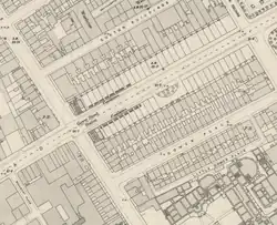 In 1864, Parliament authorised the North Western and Charing Cross Railway to construct a line to connect the mainline stations at Euston and Charing Cross. This would have connected to the MR to the west of Gower Street, but the company was unable to raise funds.[13] A revised scheme under the name of the London Central Railway (LCR) was approved in 1871. The proposals included an interchange at Gower Street with the LCR's platforms north of and parallel to the MR's.[14] LCR branches would have connected from east of Gower Street to Euston and St Pancras stations. As before, the LCR was unable to raise funding and the scheme was abandoned in 1874.[15]