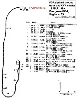 1. ^ a b c d e f g h i j k "Aircraft Accident Report: Evergreen International Airlines, McDonnell Douglas DC-9-13F, N931F, Saginaw, Texas, March 18, 1989" (PDF). National Transportation Safety Board. April 23, 1990. NTSB/AAR-90/02. Retrieved December 23, 2020. - Copy at Embry–Riddle Aeronautical University.