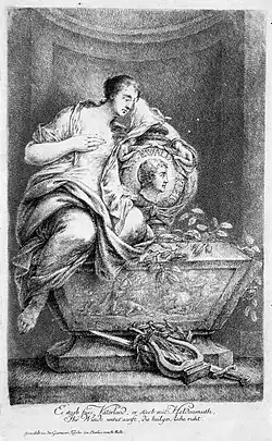Kleist also wrote some odes, idylls and elegies, and a small epic poem, Cissides und Paches (1759), the subject being two Thessalian friends who die an heroic death for their country in a battle against the Athenians.[3] Likewise, he composed epitaphs for his many friends who were killed in battle, such as Major Heinrich von Blumenthal, which eerily foretold his own:[1]