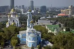 The Church of All Saints in 2016 (top left), where the Ipatiev House used to be. Voznesensky Cathedral is in the foreground, where a machine gun was mounted in the belfry aimed at the tsar and tsaritsa's bedroom on the southeastern corner of the house.[48]