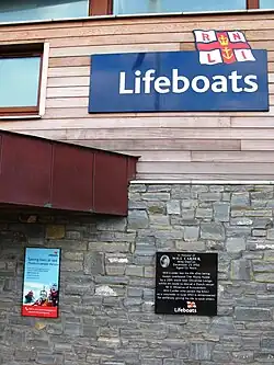 From 1961 the lifeboat was kept afloat in the river near the entrance to Exmouth docks. A boarding boat was kept on a davit that was lowered into the water to ferry the crew out to the lifeboat. The old lifeboat station by the beach was retained as a fund-raising display centre and, from 1966, was the base for an inshore lifeboat.[1] The building used by crews at the docks was demolished in 1996 and replaced by temporary portable buildings.[3] In 2005 trials were made to consider whether it would be possible to return the all-weather boat to the beach boathouse where it would not be hampered by shallow water in the river when it was needed at low tide. As a result of this it was decided to build a new boathouse further along the beach near the Maer Rocks from where both the ALB and ILB could operate at all states of the tide. The Trent-class was exchanged for an interim Mersey-class which is small enough to be housed in a boathouse, and the new facility was declared operational on 21 November 2009. The Shannon class lifeboat replaced the Mersey and reestablished the 25knot service. The old boathouse was retained as a base for the RNLI lifeguards who work in and around Exmouth.[4] until being handed back to Clinton devon estates, now used by Exmouth Rowing Club.