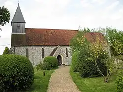 The parish contains numerous archaeological sites including a Mesolithic flint working site, Bronze Age bowl barrows and the Iron Age fort at Old Winchester Hill. There are also Roman and Dark Age sites and the site of the mediaeval village of Lomer. The 13th-century church of St Peter and St Paul was heavily restored in the 19th century.[5] The 1892 restoration (the second of the 19th century) added stained glass windows by Charles Spooner in the style of the Arts and Crafts movement.[6]