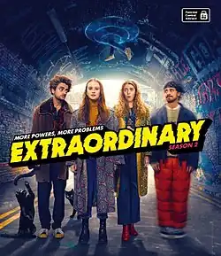 Extraordinary is a British superhero comedy television series created by Emma Moran.[1] It premiered on the Disney+ Star platform internationally, Star+ in Latin America and Hulu in the United States, on 25 January 2023.[2] It received generally positive reviews, and was renewed for a second season on 23 January 2023, ahead of the series premiere.[3][4] Season 2 became available to stream 6 March 2024 on Hulu in the US and on Disney+ in other markets.[5] The premise is that everyone in the world develops a superpower at the age of 18, and the show follows Jen, who, six years after turning 18, still hasn't discovered her superpower. The series was cancelled after two seasons.[6]
